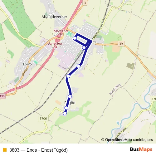 The first stop of the 3803 bus route is Encs, autóbusz-állomás and the last stop is Encs (Fügöd), autóbusz-forduló. 3803 (Encs - Encs(Fügöd)) is operational during on weekdays.