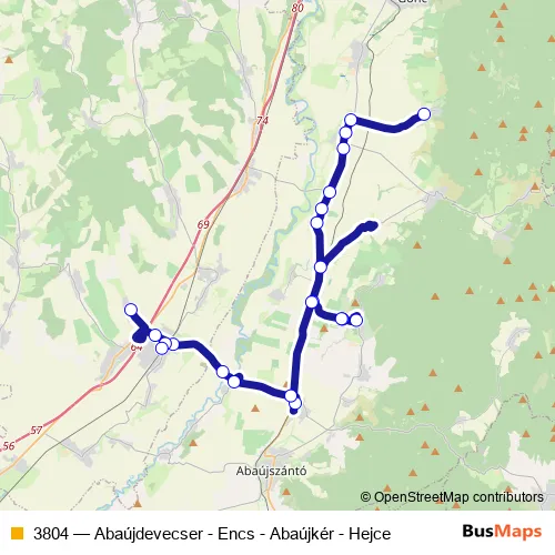 The first stop of the 3804 bus route is Hejce, községháza and the last stop is Encs (Abaújdevecser), autóbusz-forduló. 3804 (Abaújdevecser - Encs - Abaújkér - Hejce) is operational during on weekdays.