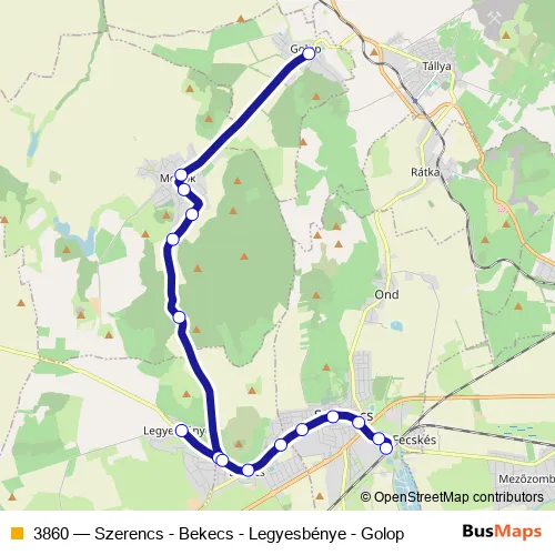 The first stop of the 3860 bus route is Golop, autóbusz-forduló and the last stop is Szerencs, vasútállomás. 3860 (Szerencs - Bekecs - Legyesbénye - Golop) is operational during everyday.