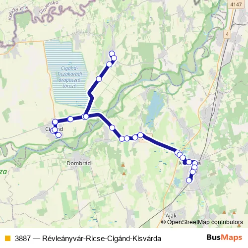 The first stop of the 3887 bus route is Ricse, vegyesbolt and the last stop is Kisvárda, autóbusz-állomás. 3887 (Révleányvár-Ricse-Cigánd-Kisvárda) is operational during everyday.