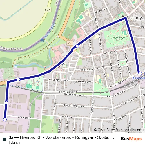 The first stop of the 3a bus route is Balassagyarmat, vasútállomás and the last stop is Balassagyarmat, Kábelgyár. 3a (Bremas Kft - Vasútállomás - Ruhagyár - Szabó L. iskola) is operational during on weekdays.
