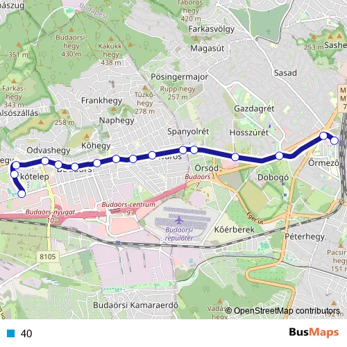 The first stop of the 40 bus route is Budaörsi lakótelep and the last stop is Kelenföld vasútállomás M. 40 is operational during everyday.