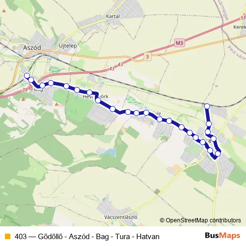 The first stop of the 403 bus route is Tura, vasútállomás and the last stop is Bag, vasútállomás. 403 (Gödöllő - Aszód - Bag - Tura - Hatvan) is operational during everyday.