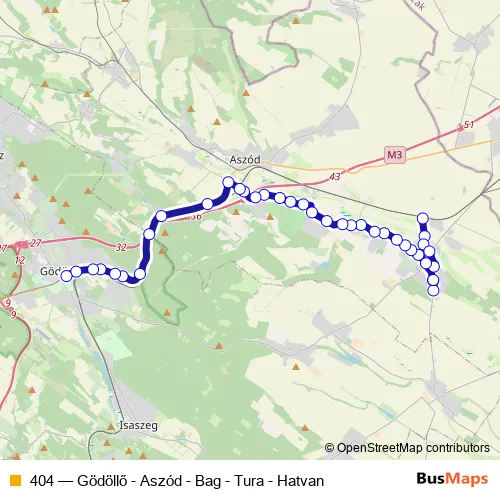 The first stop of the 404 bus route is Gödöllő, autóbusz-állomás and the last stop is Tura, vasútállomás. 404 (Gödöllő - Aszód - Bag - Tura - Hatvan) is operational during everyday.