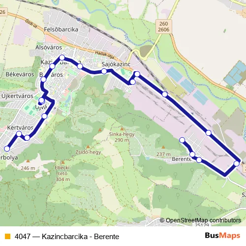 The first stop of the 4047 bus route is Berentebánya and the last stop is Kazincbarcika, Vájár utca autóbusz-forduló. 4047 (Kazincbarcika - Berente) is operational during on weekdays.