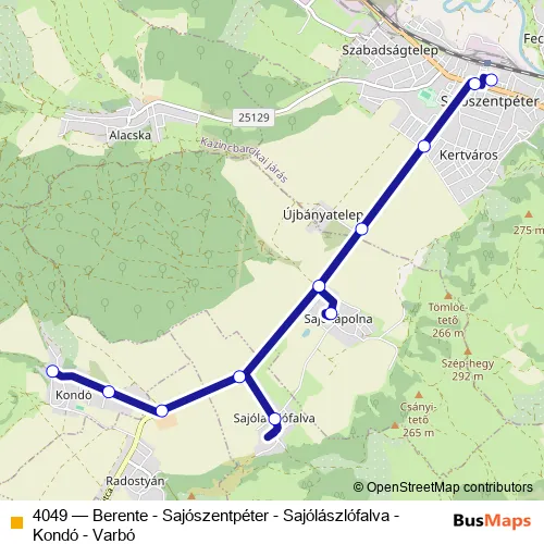 The first stop of the 4049 bus route is Kondó, autóbusz-forduló and the last stop is Sajószentpéter, Semmelweis utcai óvoda. 4049 (Berente - Sajószentpéter - Sajólászlófalva - Kondó - Varbó) is operational during on weekdays.