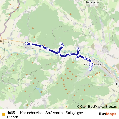 The first stop of the 4065 bus route is Putnok, Fő tér and the last stop is Kazincbarcika, autóbusz-állomás. 4065 (Kazincbarcika - Sajóivánka - Sajógalgóc - Putnok) is operational during everyday.