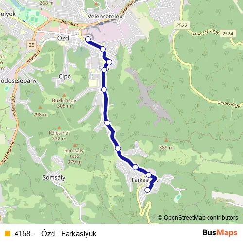 The first stop of the 4158 bus route is Farkaslyuk, Vájár út and the last stop is Ózd, autóbusz-állomás. 4158 (Ózd - Farkaslyuk) is operational during everyday.