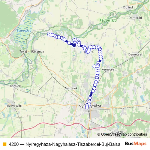 The first stop of the 4200 bus route is Tiszabercel, szakiskola and the last stop is Nyíregyháza, autóbusz-állomás. 4200 (Nyíregyháza-Nagyhalász-Tiszabercel-Buj-Balsa) is operational during everyday.
