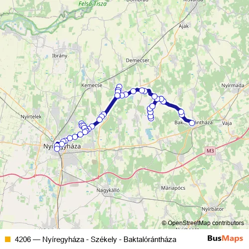 The first stop of the 4206 bus route is Nyíribrony, autóbusz-forduló and the last stop is Nyíregyháza, autóbusz-állomás. 4206 (Nyíregyháza - Székely - Baktalórántháza) is operational during everyday.