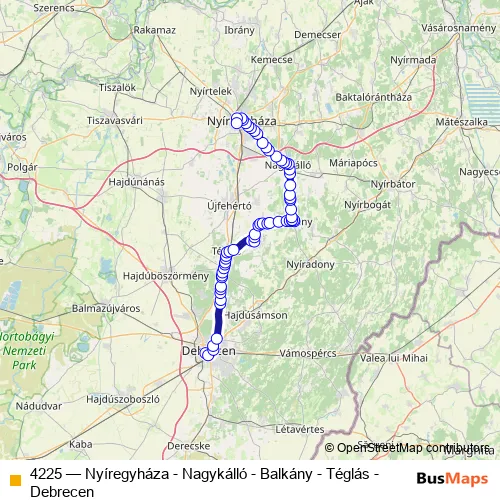 The first stop of the 4225 bus route is Téglás, vasútállomás and the last stop is Nyíregyháza, autóbusz-állomás. 4225 (Nyíregyháza - Nagykálló - Balkány - Téglás - Debrecen) is operational during everyday.