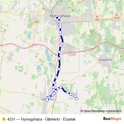 Click here to view the nearest 4231 - Nyíregyháza - Újfehértó - Érpatak bus stop.