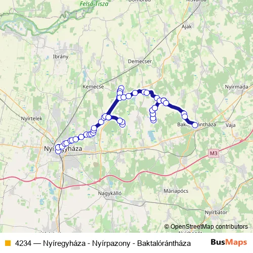 The first stop of the 4234 bus route is Nyíregyháza, autóbusz-állomás and the last stop is Baktalórántháza, Fő tér. 4234 (Nyíregyháza - Nyírpazony - Baktalórántháza) is operational during everyday.