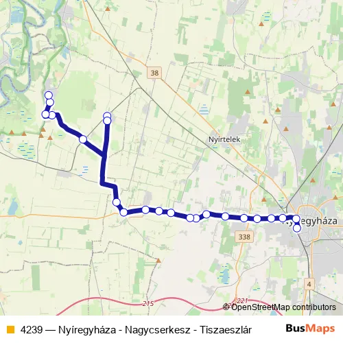 The first stop of the 4239 bus route is Nyíregyháza, autóbusz-állomás and the last stop is Tiszaeszlár, községháza. 4239 (Nyíregyháza - Nagycserkesz - Tiszaeszlár) is operational during everyday.