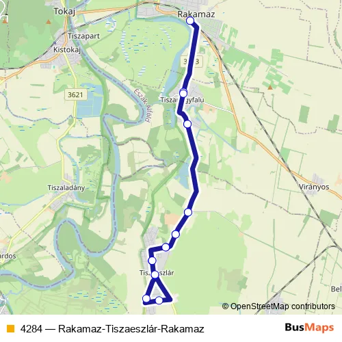 The first stop of the 4284 bus route is Rakamaz, vasútállomás and the last stop is Rakamaz, vasútállomás. 4284 (Rakamaz-Tiszaeszlár-Rakamaz) is operational during on weekdays.