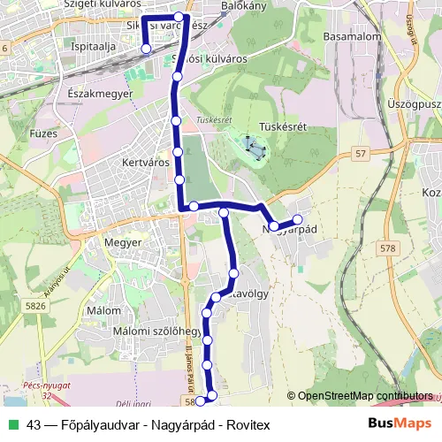 Bus 43 - Főpályaudvar - Nagyárpád - Rovitex: Full Schedule in Pecs