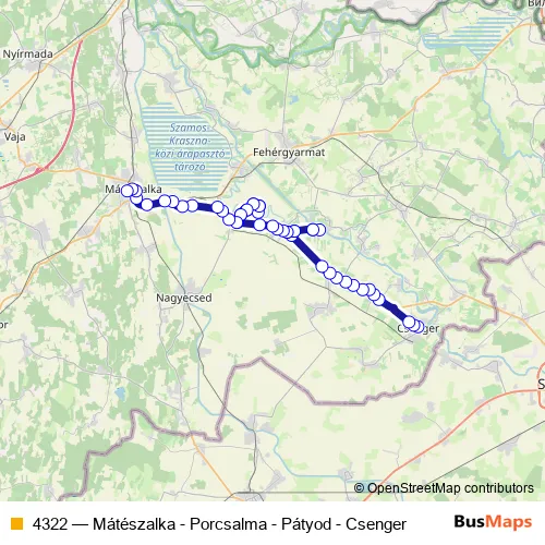 The first stop of the 4322 bus route is Csenger, autóbusz-állomás and the last stop is Mátészalka, autóbusz-állomás. 4322 (Mátészalka - Porcsalma - Pátyod - Csenger) is operational during everyday.