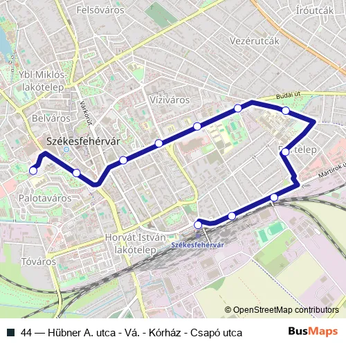 The first stop of the 44 bus route is Székesfehérvár, vasútállomás and the last stop is Székesfehérvár, Csapó utca. 44 (Hübner A. utca - Vá. - Kórház - Csapó utca) is operational during everyday.
