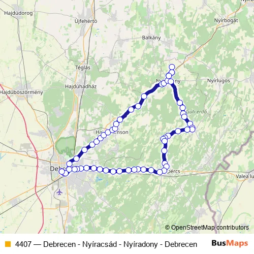 The first stop of the 4407 bus route is Debrecen, autóbusz-állomás and the last stop is Debrecen, autóbusz-állomás. 4407 (Debrecen - Nyíracsád - Nyíradony - Debrecen) is operational during on weekdays.