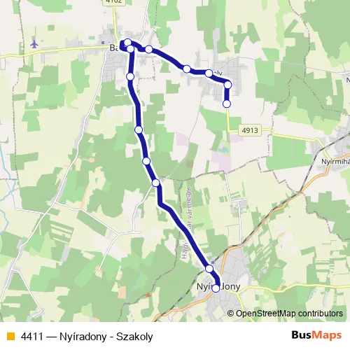 The first stop of the 4411 bus route is Szakoly, autóbusz-forduló and the last stop is Nyíradony, Árpád tér. 4411 (Nyíradony - Szakoly) is operational during on weekdays.