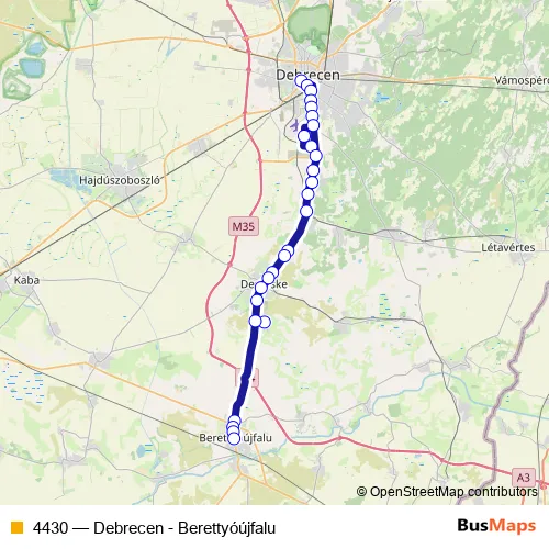 The first stop of the 4430 bus route is Debrecen, autóbusz-állomás and the last stop is Berettyóújfalu, autóbusz-állomás. 4430 (Debrecen - Berettyóújfalu) is operational during everyday.