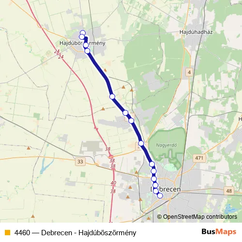 The first stop of the 4460 bus route is Hajdúböszörmény, Kálvin tér and the last stop is Debrecen, autóbusz-állomás. 4460 (Debrecen - Hajdúböszörmény) is operational during everyday.