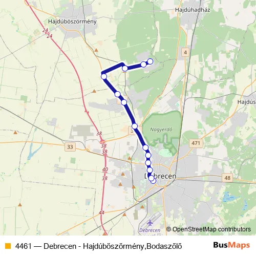 The first stop of the 4461 bus route is Debrecen, autóbusz-állomás and the last stop is Hajdúböszörmény (Bodaszőlő). 4461 (Debrecen - Hajdúböszörmény,Bodaszőlő) is operational during everyday.