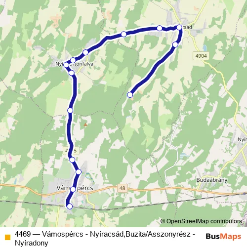 The first stop of the 4469 bus route is Nyíracsád, Buzita and the last stop is Vámospércs, vasútállomás. 4469 (Vámospércs - Nyíracsád,Buzita/Asszonyrész - Nyíradony) is operational during everyday.