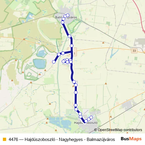 The first stop of the 4476 bus route is Hajdúszoboszló, autóbusz-állomás and the last stop is Balmazújváros, vasútállomás. 4476 (Hajdúszoboszló - Nagyhegyes - Balmazújváros) is operational during everyday.