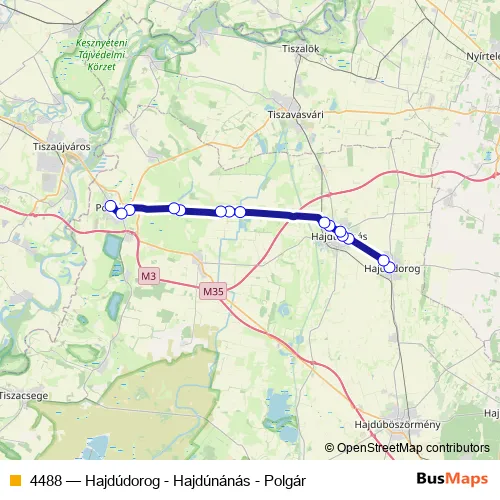 The first stop of the 4488 bus route is Hajdúdorog, Akácfa utca and the last stop is Polgár, autóbusz-váróterem. 4488 (Hajdúdorog - Hajdúnánás - Polgár) is operational during everyday.