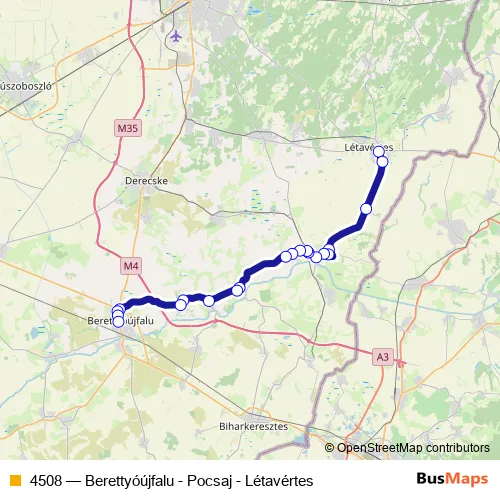 The first stop of the 4508 bus route is Létavértes, autóbusz-váróterem and the last stop is Berettyóújfalu, autóbusz-állomás. 4508 (Berettyóújfalu - Pocsaj - Létavértes) is operational during everyday.