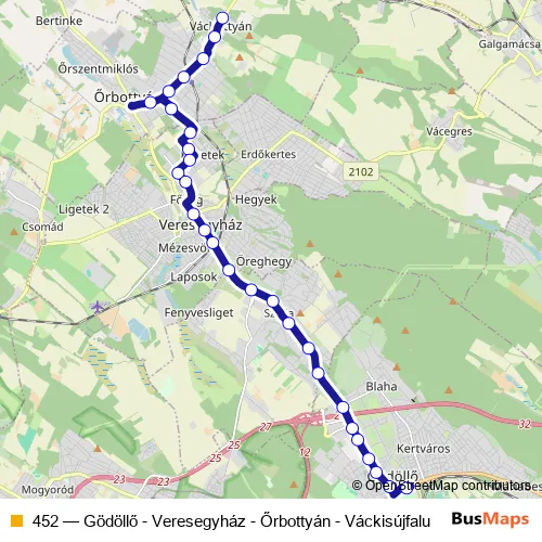 The first stop of the 452 bus route is Őrbottyán, Rákóczi Ferenc utca autóbusz-forduló and the last stop is Gödöllő, autóbusz-állomás. 452 (Gödöllő - Veresegyház - Őrbottyán - Váckisújfalu) is operational during on weekdays.