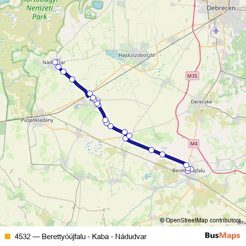 The first stop of the 4532 bus route is Berettyóújfalu, kórház and the last stop is Nádudvar, autóbusz-váróterem. 4532 (Berettyóújfalu - Kaba - Nádudvar) is operational during everyday.