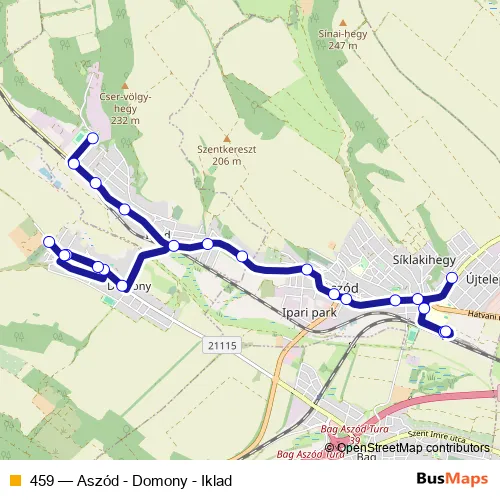 The first stop of the 459 bus route is Aszód, vasútállomás and the last stop is Iklad, Ipari Műszergyár. 459 (Aszód - Domony - Iklad) is operational during everyday.