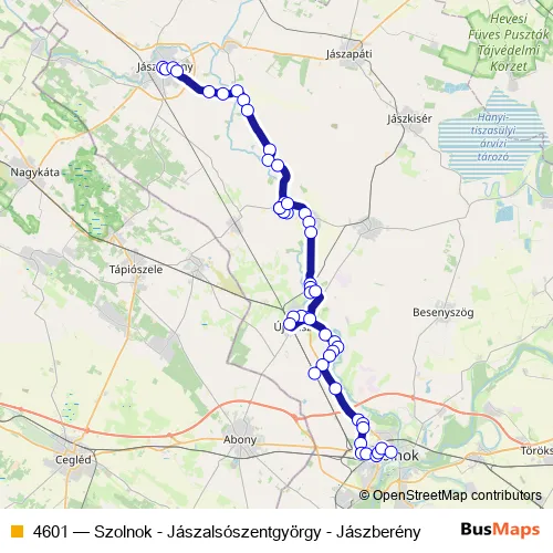 The first stop of the 4601 bus route is Jászberény, autóbusz-állomás and the last stop is Szolnok, autóbusz-állomás. 4601 (Szolnok - Jászalsószentgyörgy - Jászberény) is operational during everyday.