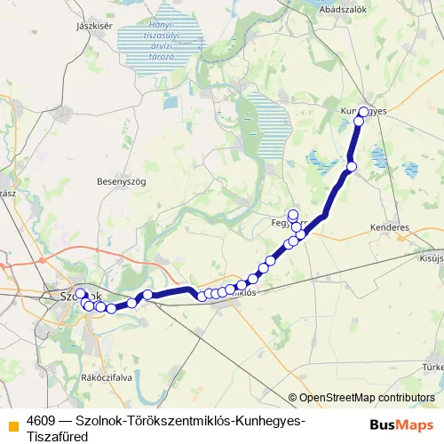 The first stop of the 4609 bus route is Szolnok, autóbusz-állomás and the last stop is Kunhegyes, autóbusz-állomás. 4609 (Szolnok-Törökszentmiklós-Kunhegyes-Tiszafüred) is operational during on weekdays.