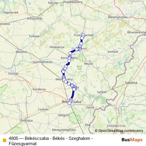 The first stop of the 4805 bus route is Füzesgyarmat, városháza and the last stop is Békéscsaba, autóbusz-állomás. 4805 (Békéscsaba - Békés - Szeghalom - Füzesgyarmat) is operational during everyday.