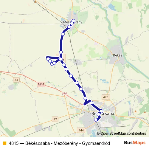 The first stop of the 4815 bus route is Mezőberény, Liget utca and the last stop is Békéscsaba, autóbusz-állomás. 4815 (Békéscsaba - Mezőberény - Gyomaendrőd) is operational during everyday.