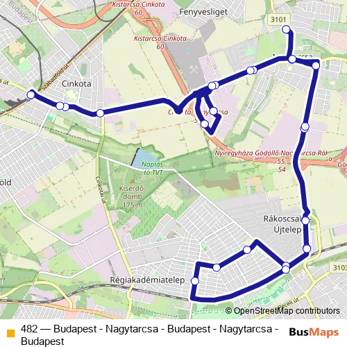 The first stop of the 482 bus route is Budapest, Cinkota HÉV-állomás and the last stop is Budapest, Cinkota HÉV-állomás. 482 (Budapest - Nagytarcsa - Budapest - Nagytarcsa - Budapest) is operational during everyday.