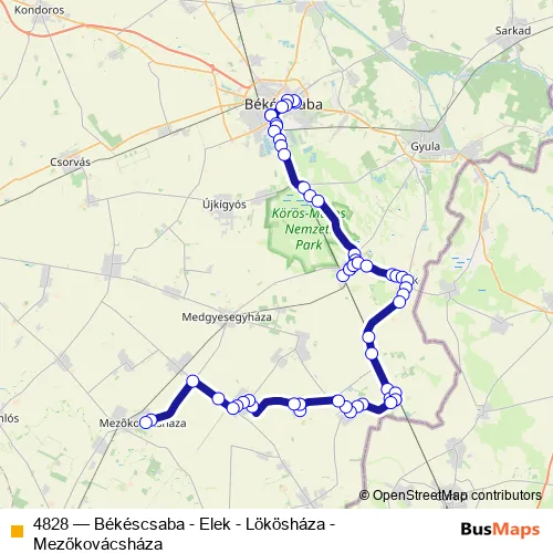 The first stop of the 4828 bus route is Békéscsaba, autóbusz-állomás and the last stop is Mezőkovácsháza, autóbusz-állomás. 4828 (Békéscsaba - Elek - Lökösháza - Mezőkovácsháza) is operational during everyday.