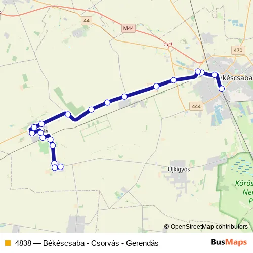 The first stop of the 4838 bus route is Békéscsaba, autóbusz-állomás and the last stop is Gerendás, autóbusz-váróterem. 4838 (Békéscsaba - Csorvás - Gerendás) is operational during everyday.
