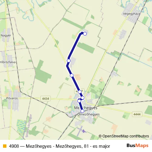Click here to view the nearest 4908 - Mezőhegyes - Mezőhegyes, 81 - es major bus stop.