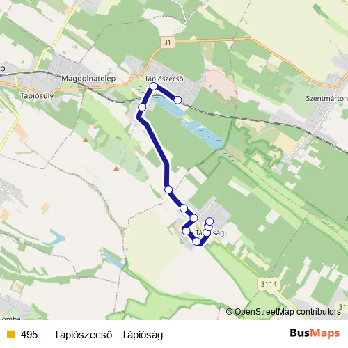 The first stop of the 495 bus route is Tápiószecső, vasútállomás and the last stop is Tápióság, autóbusz-forduló. 495 (Tápiószecső - Tápióság) is operational during everyday.
