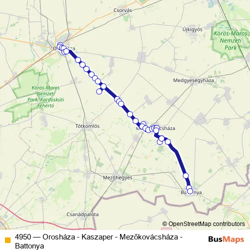 The first stop of the 4950 bus route is Orosháza, autóbusz-állomás and the last stop is Battonya, autóbusz-váróterem. 4950 (Orosháza - Kaszaper - Mezőkovácsháza - Battonya) is operational during everyday.