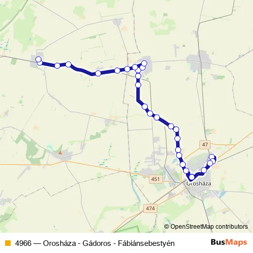The first stop of the 4966 bus route is Orosháza, Síküveggyár and the last stop is Gádoros, autóbusz-váróterem. 4966 (Orosháza - Gádoros - Fábiánsebestyén) is operational during everyday.