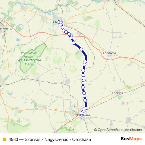 The first stop of the 4980 bus route is Szarvas, autóbusz-állomás and the last stop is Orosháza, autóbusz-állomás. 4980 (Szarvas - Nagyszénás - Orosháza) is operational during everyday.