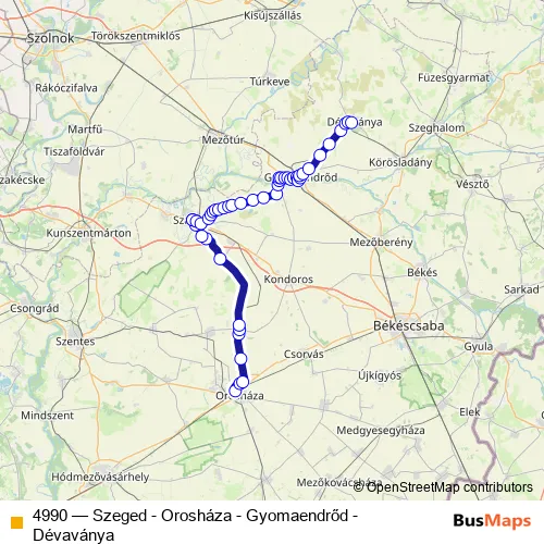 The first stop of the 4990 bus route is Orosháza, autóbusz-állomás and the last stop is Dévaványa, városháza. 4990 (Szeged - Orosháza - Gyomaendrőd - Dévaványa) is operational during everyday.