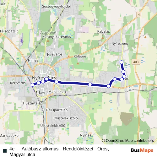 The first stop of the 4e bus route is Nyíregyháza, Oros, temető and the last stop is Nyíregyháza, autóbusz-állomás. 4e (Autóbusz-állomás - Rendelőintézet - Oros, Magyar utca) is operational during on weekdays.