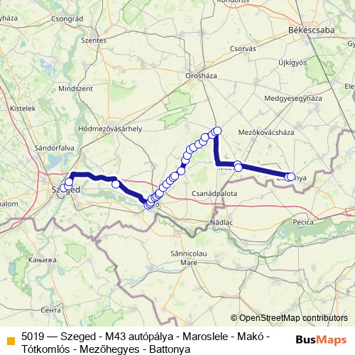 The first stop of the 5019 bus route is Szeged, autóbusz-állomás and the last stop is Battonya, autóbusz-váróterem. 5019 (Szeged - M43 autópálya - Maroslele - Makó - Tótkomlós - Mezőhegyes - Battonya) is operational during everyday.
