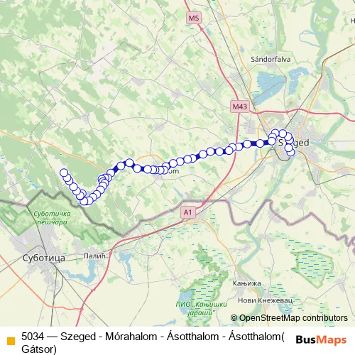 The first stop of the 5034 bus route is Szeged, vasútállomás and the last stop is Ásotthalom, Gátsor, Krisztin kúria. 5034 (Szeged - Mórahalom - Ásotthalom - Ásotthalom(Gátsor)) is operational during everyday.